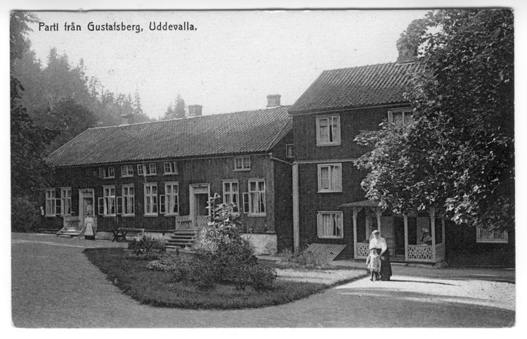 Tryckt text på vykortets framsida: "Parti från Gustafsberg, Uddevalla."