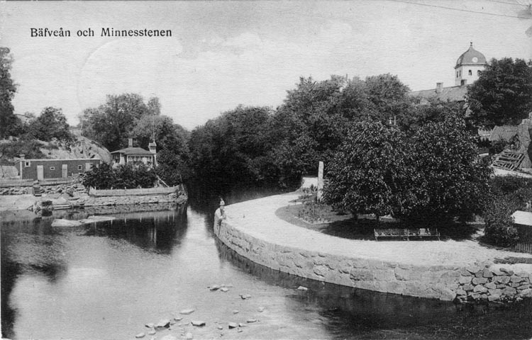 Tryckt text på vykortets framsida: "Bäfveån och Minnesstenen."