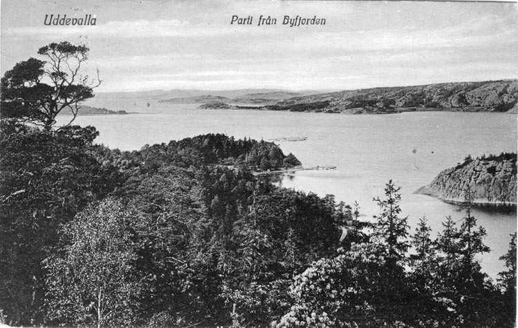 Tryckt text på vykortets framsida: "Uddevalla. Parti från Byfjorden."
