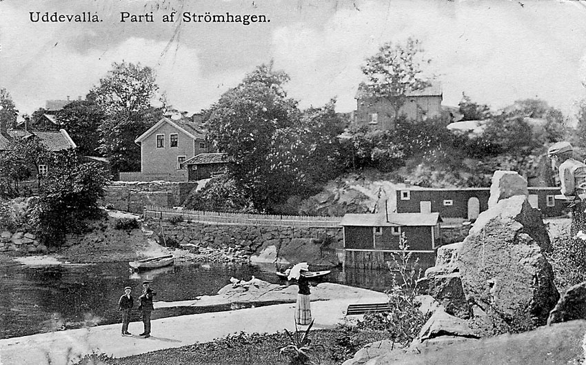 Tryckt text på vykortets framsida: "Uddevalla Parti af Strömhagen".
