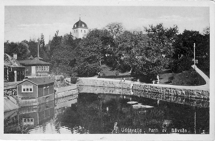 Tryckt text på vykortets framsida: "Uddevalla Parti av Bäveån".