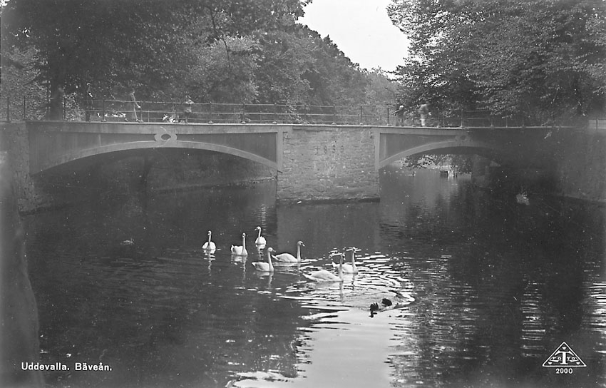 Tryckt text på vykortets framsida: "Uddevalla Bäveån".