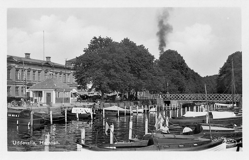 Tryckt text på vykortets framsida: "Uddevalla, Hamn".