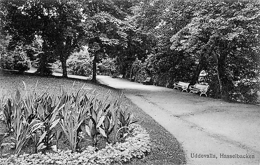 Tryckt text på vykortets framsida: "Uddevalla. Hasselbacken".