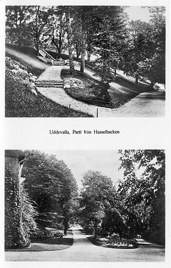 Tryckt text på vykortets framsida: "Uddevalla. Parti från Hasselbacken".