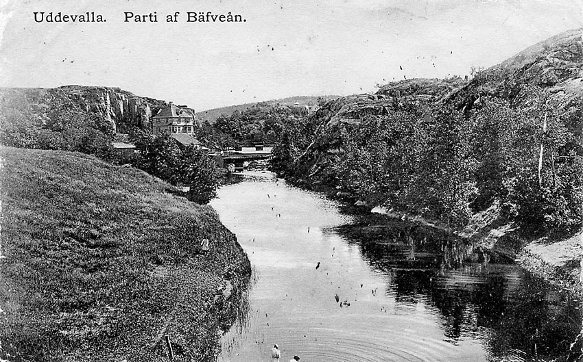 Tryckt text på vykortets framsida: "Uddevalla. Parti af Bäfveån".