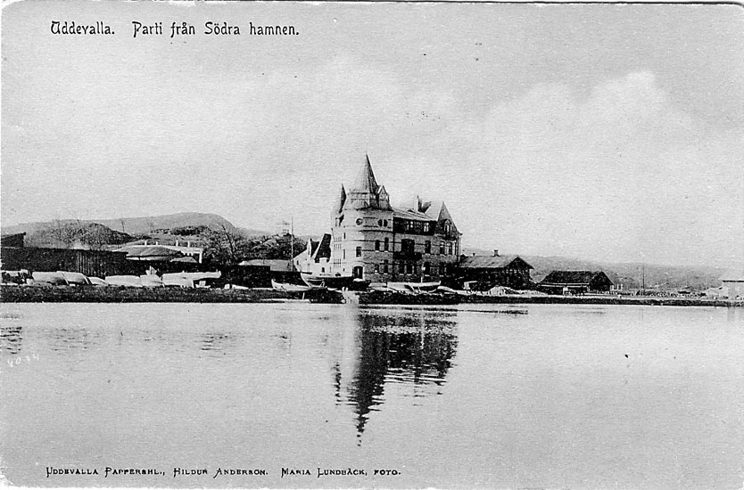 Tryckt text på vykortets framsida: "Uddevalla Parti från södra hamnen".