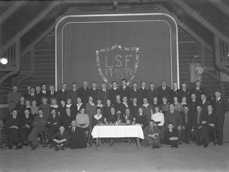 Text till bilden:"Män och kvinnor i en stor sal. Deras föreningsmärke på väggen. Framför dem ett bord med polaler. L.S.F 19 30/3 44".