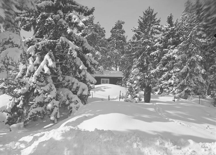 Text till bilden:"Snötyngda granar och ett litet hus inne bland dem.Fru Kullgren står i snön intill en gran".