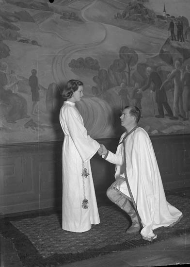 Text till bilden:"Ett par ungdommar i en teaterakt. Båda är lkädda i vitt.".