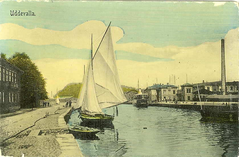 Tryckt text på vykortets framsida: "Parti af Hamnen, Uddevalla".