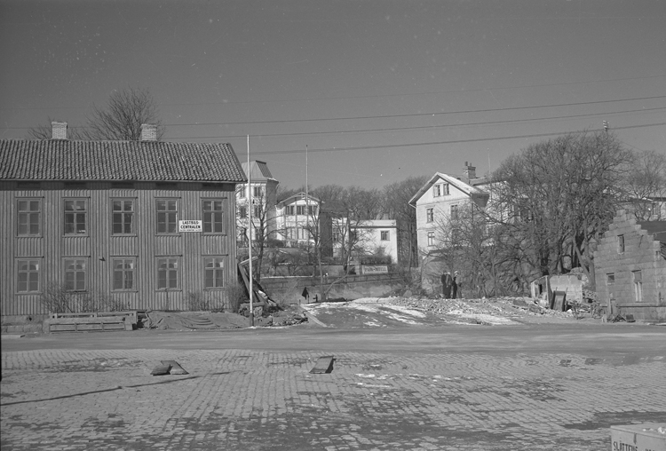 Titel: Text till bilden: "Södra Hamngatan före breddningen o Hotellbygge"