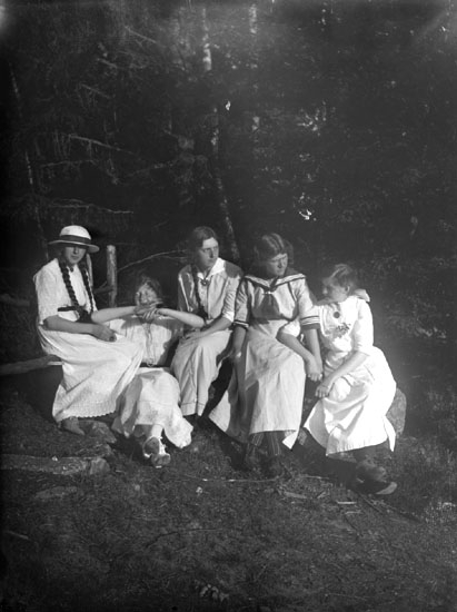 Enligt senare noteringar: "Ragna Olsen, Astrid Höyer-Finn, Karin Gerdtsson, Ester Helgesson och Torborg Johansson taget på Fröland, midsommarafton. 23/6 1915."