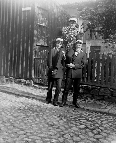 Enligt senare noteringar: "Ego efter studentexamen på Palmqvists och Hugo Anderssons axlar. Taget utanför porten, 6/6 1916."