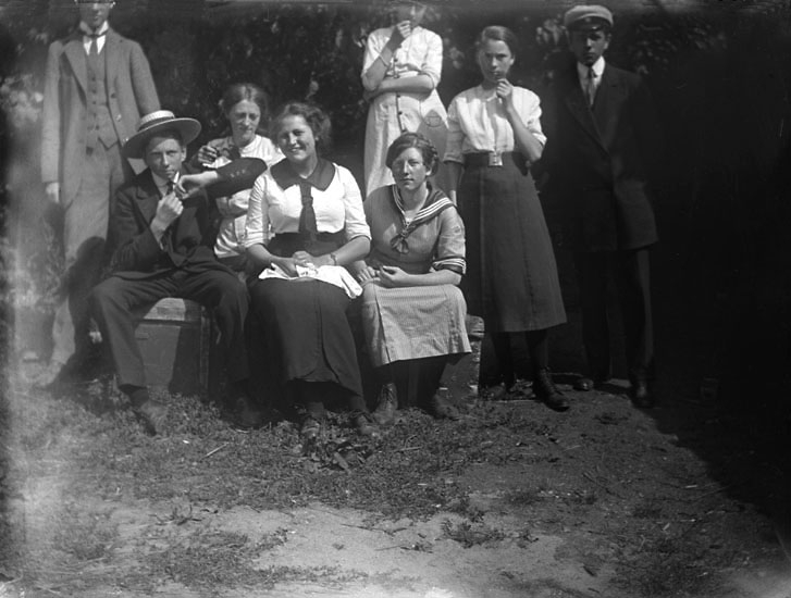 En grupp människor har samlats för att bli fotograferade. Sommarbild med halmhattar och uppkavlade ärmar