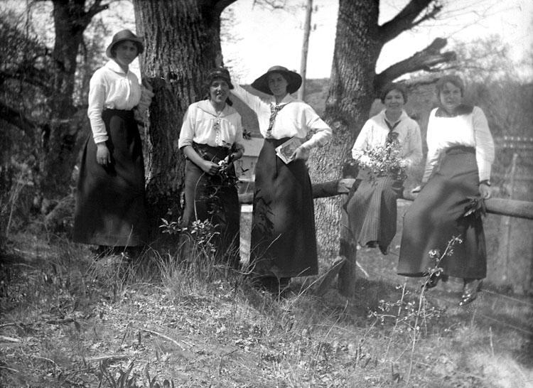 Enligt senare noteringar: " Anna Jakobsson, Ingrid Olsson, Emma Jakobsson, Esther Helgesson, taget vid Höjentorp. I bakgrunden ett par stora träd. 24/5 1915."