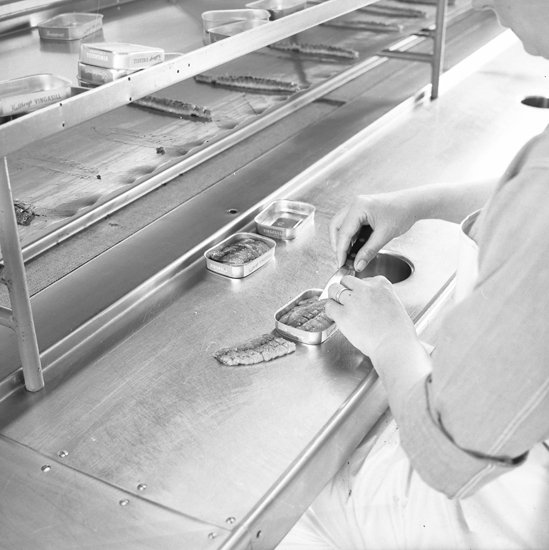 Text till bilden: "Lysekil. Skandia Konservfabrik. Interiör. 1956"