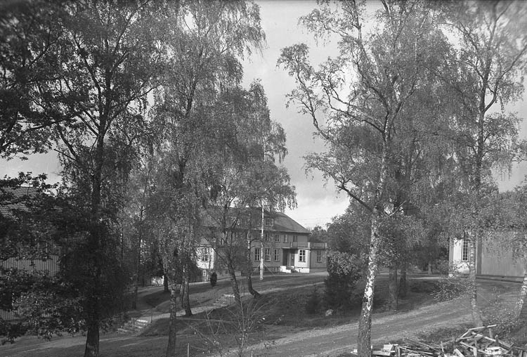 Text till bilden:"Skolans huvudbyggnad och anex. Några lövträd samt en skräphög".