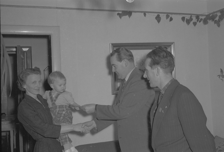 Text till bilden: "Överlämnande av insamling t. Fru Strandberg. 1954.11"