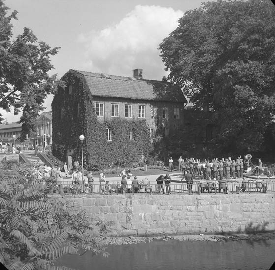 Hasselbackshuset och Bäveån, militärorkester till höger i bild.