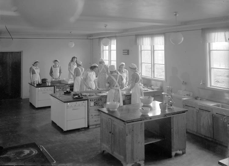 Text till bilden:"En grupp flickor i skolköksundervisning. V.U.S.".
