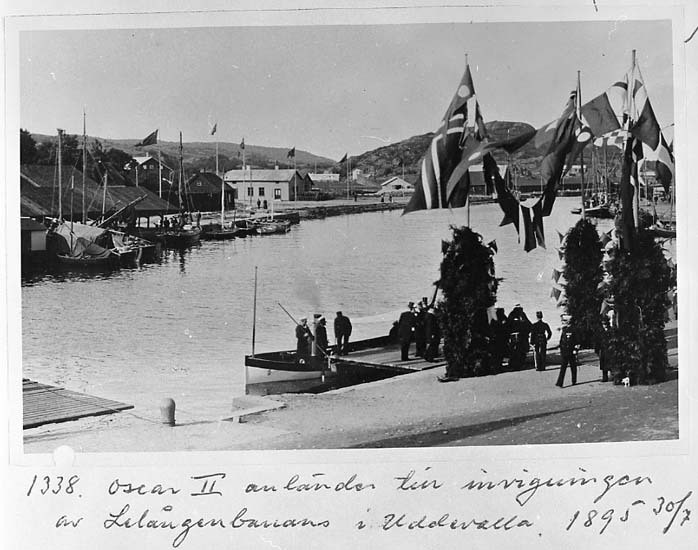Medföljande text: "Oscar II anländer till invigningen av Lelångenbanan i Uddevalla år 1895 30/7. UM 185/67 U.M.F. 1338 Mapp 4".