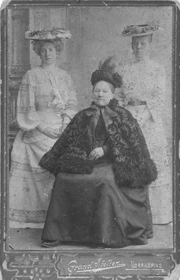 Text till bilden: "Döttrarna Thora till vänster, Hedvig (Hedda) till höger samt deras mor Johanna Beata Sofia i mitten".
