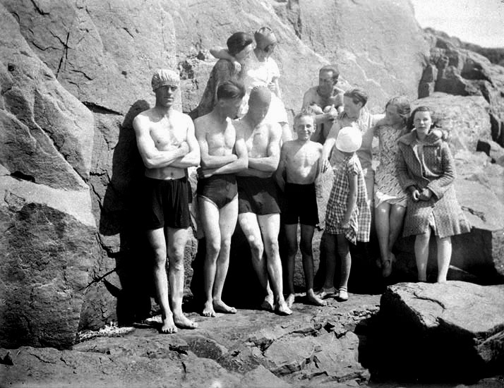 Enligt senare noteringar: "Badpojkar uppvaktade av påklädda flickor: Karl Persson och Johan Börjesson-Eld bl a".