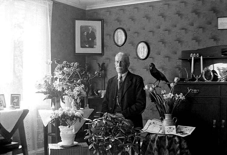 Enligt senare noteringar: "Man bredvid en uppstoppad fågel. Patrik Börjesson-Eld vid en födelsedag."