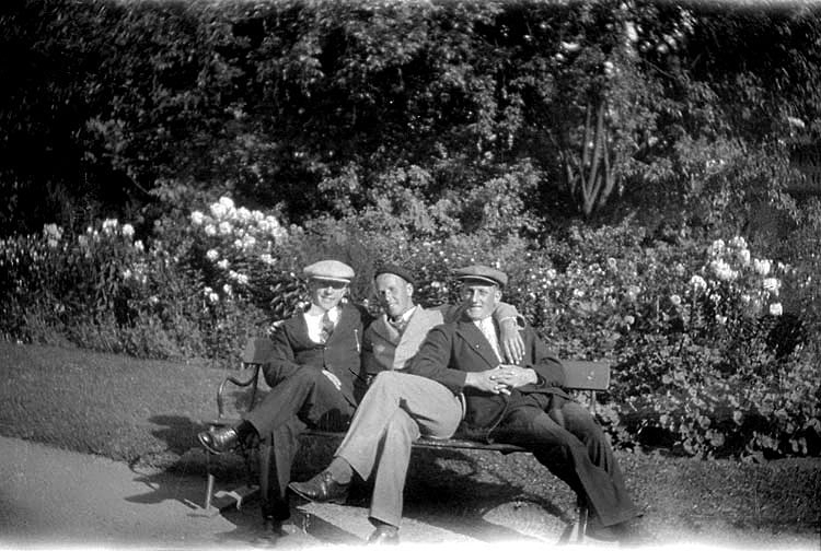 Enligt tidigare noteringar av Erik Karlsson: "På soffan i en vacker park,: kamraterna Viborg, Hjalmar och Gunnar Bjelkert".