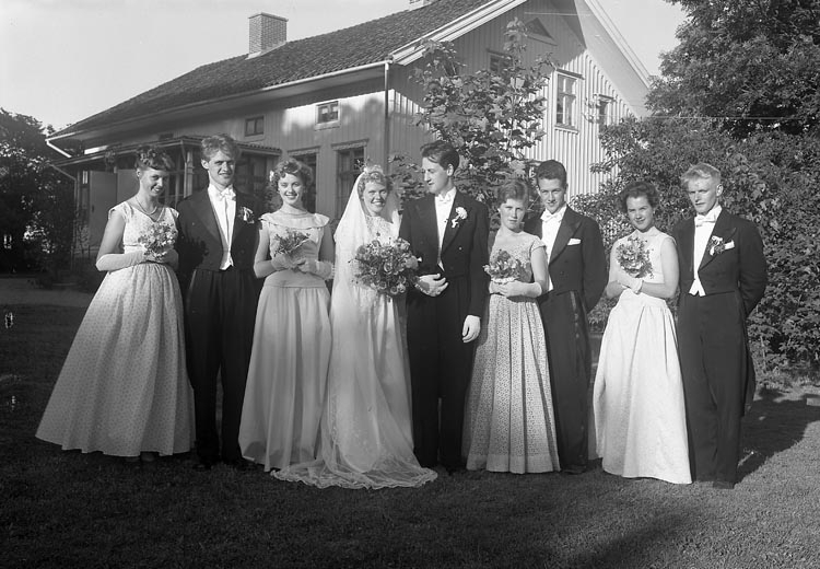 Enligt fotografens journal nr 8 1951-1957: "Johnson, Brudp. Prästgården med tärnor Spekeröd".