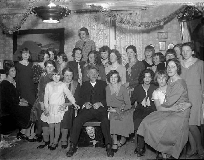 Helga Karlsson, Ingrid Edberg, Asta Karlsson, Judith Johansson, Valborg Johansson, Albertina och Viktor Johansson, Ingrid Mellander, Karin Karlsson, Märta Eriksson, Elsa Moberg, Gullan Niklasson, Nanny Melander, Danny Löf, Natalia Olsson, Maja Johansson, Tekla Börjesson (1907-1996, syster till Johan Börjesson-Eld), Karin Niklasson. Liggande: Anna Johansson".
