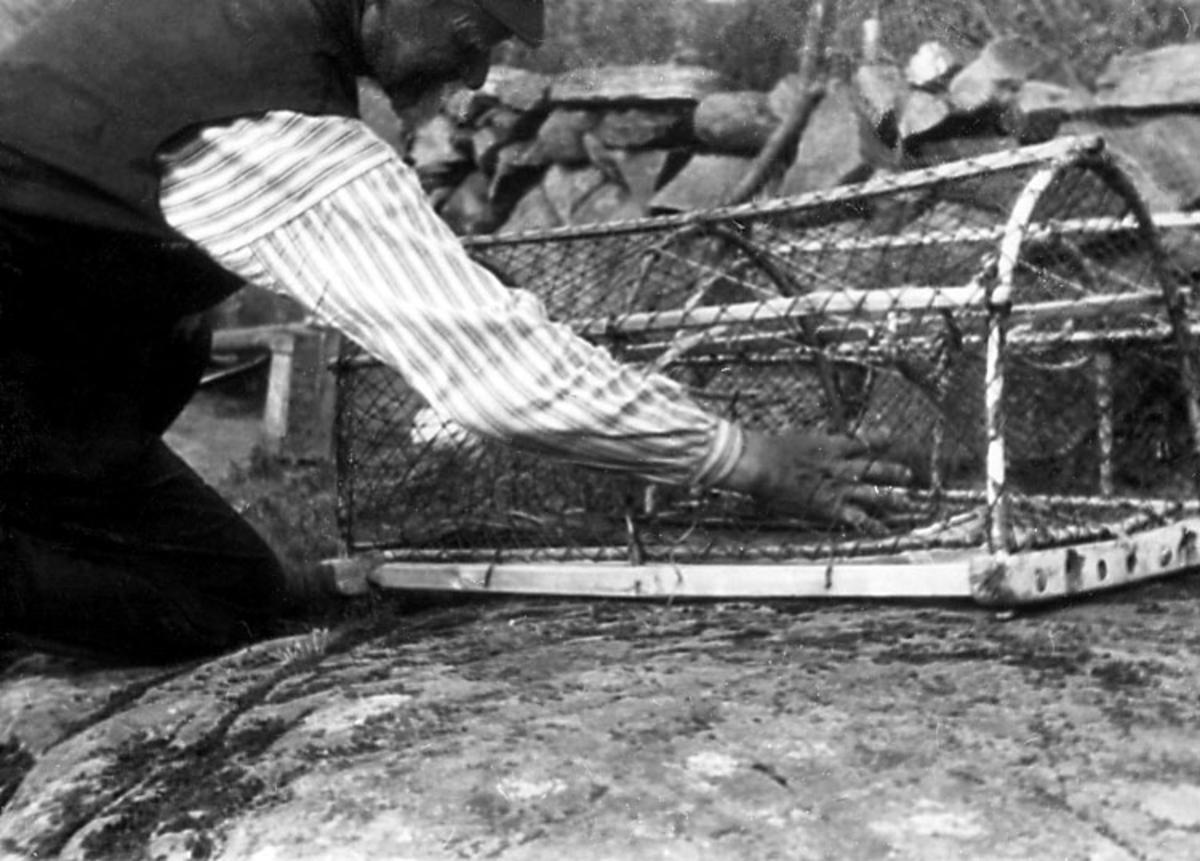 Skrivet på baksidan: Halland, Viske hd, Värö sn., Båtfjorden. Hummerkupa, mannen visar snörpehålet där man tar ut den fångade hummern.