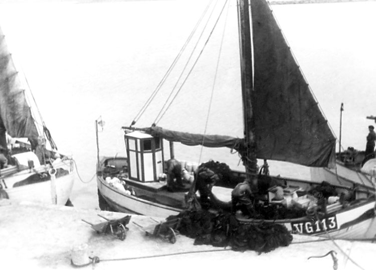 Skrivet på baksidan: Halland, Viske hd, Värö sn, Båtfjorden. Garnen kastas iland för att köras till räckan.