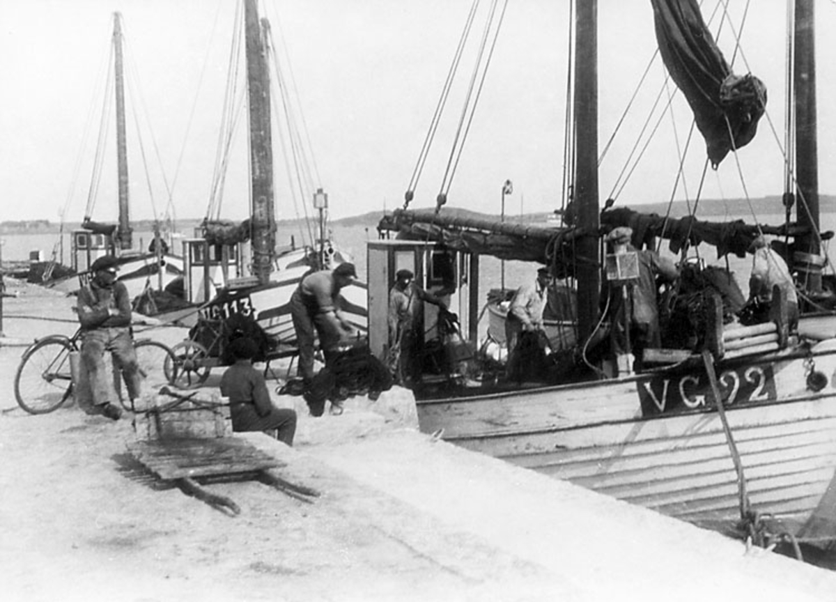 Skrivet på baksidan: Halland, Viske hd, Värö sn., Båtfjorden. Hästgarn tages i land för att köras till räckorna.