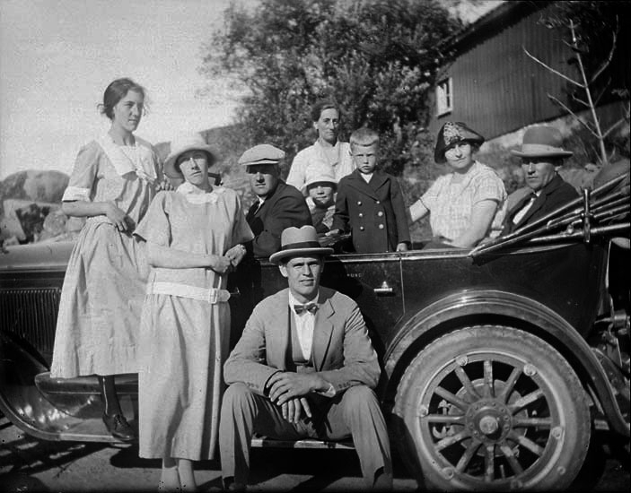 Enligt senare noteringar: "Vid och i automobilen: Tekla Börjesson-Eld, Linnea Blank, Maria Börjesson, (okänd), Erik Blank (1895-1980), (okänd), herr och fru Backman med sonen Evert (1920-1999). Linnea Blank var anställd hos fru Backman, när hon kom till Göteborg."