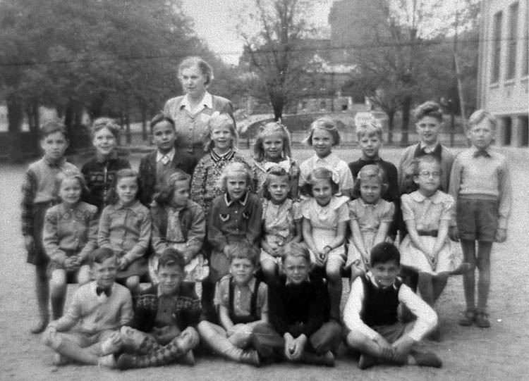 Text till bilden: "Rosa Levin med klass 2 på Margretegärde 1948. H. Brodin, N-Å Wagner, B. Nordberg, B. Gustafsson, L. Fridell, B. Andersson, U. Johansson, G. högström, L.Sipilä, B. Olsson, G. Sandberg, U. Hansson, I-L. Johansson, C. Nilsson, P-O. Karlsson, R. Gregart, B. Johansson, A. Holmgren, L. Ode, B-G. Dahlberg, P-E Zachau, H. Gergils". Finns i bok om U-a del 2 sid 29.