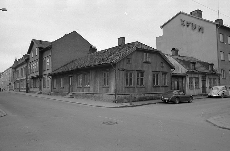 Text till bilden"Bilden från mitten av 60-talet visar korsningen Östergatan-Agnebergsgatan. Huset längst till vänster, Östergatan 3 är borta och förslag finns att riva även nr 5 för att bygga studentbostäder".