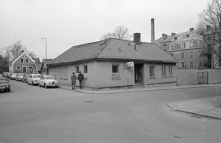Text till bilden"Så här såg det ut i hörnet Östergatan-Agnebergsgatan på mitten av 60-talet. Västsvenska Rör var beläget i huset närmast i bild§".