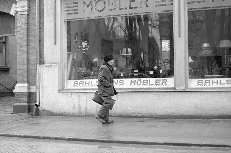 Text till bilden: "Gubbe" vid Sahlstens möbler N:a Hamngatan". Album 4 bild 7.