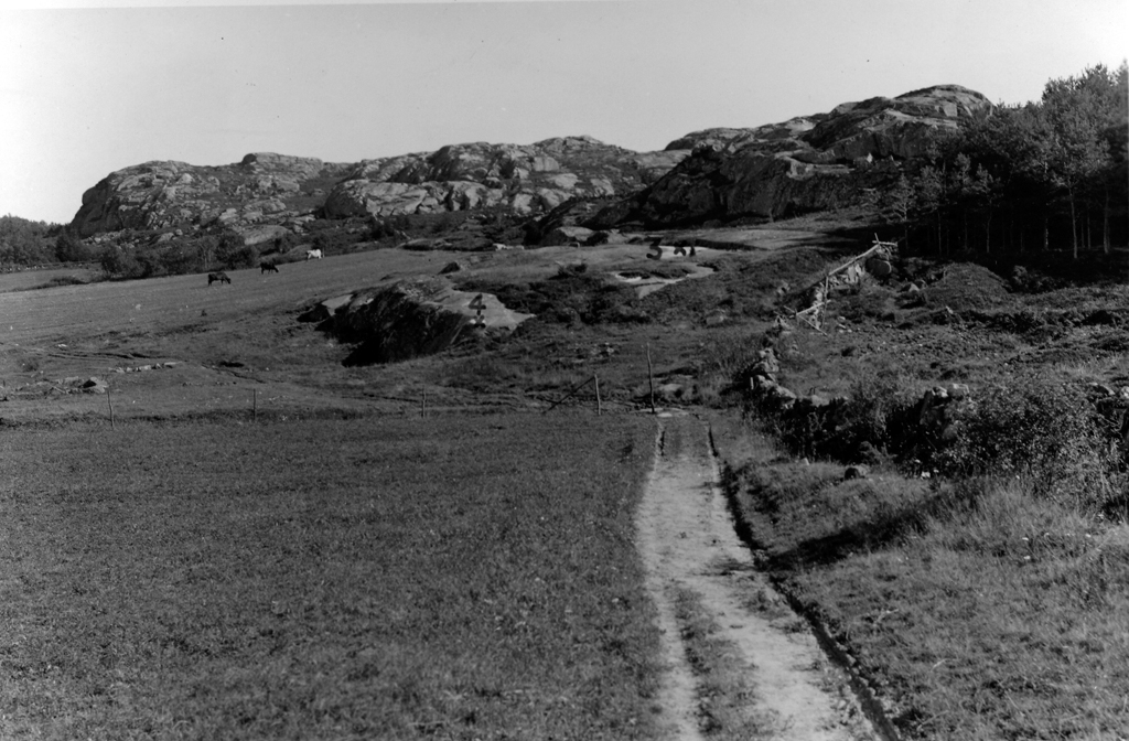 Enligt text: "Askekärr, Övre Tun, Svenneby sn. Hällristningarna n:r 3-4. Sett från V. Foto den 18 sept 1941. Å. F. Plåt n:r 1573".