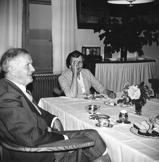 Enligt uppgift: "Hans Pettersson med fru Dagmar på kaffe hos Åkermo´s. Fotografiet taget i biblioteket, 1960-talet".