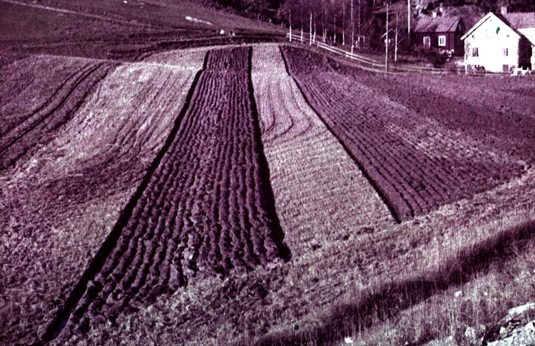 Pågående plöjning av stubbåker. Sannolikt höstplöjning.