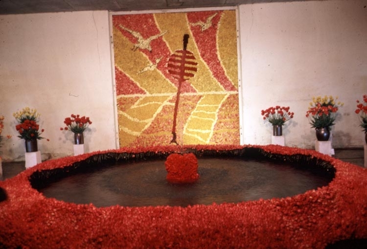 Tavla föreställande ett glittrande havslandskap med måsar och en prick (ett sjömärke). I förgrunden en skapelse av samma odlade material, troligtvis tulpaner.