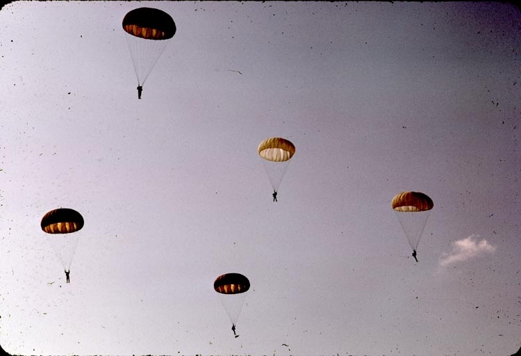 Fallskärmshoppare i solnedgång sommaren 1965. Troligen fällda från Herculesplan; se foton UMFA53418:0281 och UMFA53418:0282
