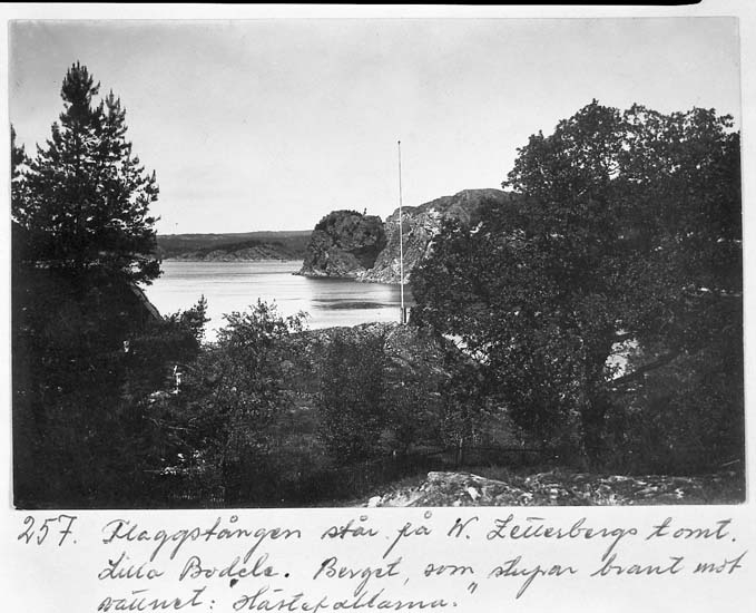 Text på kortet: "257. Flaggstången står på W. Zetterbergs tomt. Lilla Bodele. Berget som stupar brant mot vattnet: "Hästepallarna".