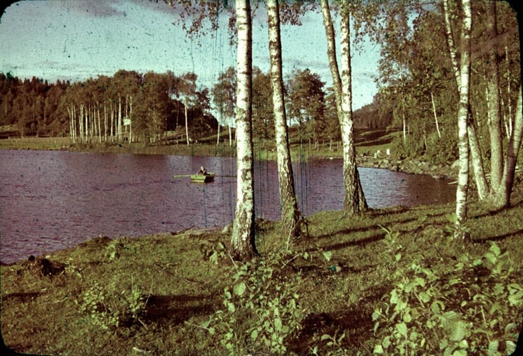 Kolbengtserödsjöns nordöstra del. En man i en flatbottnad båt ror på sjön.