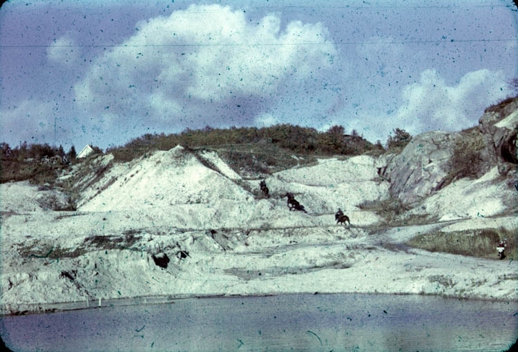 Tre ryttare med hästar rider upp för skalsbankarna i Kuröd, Uddevalla