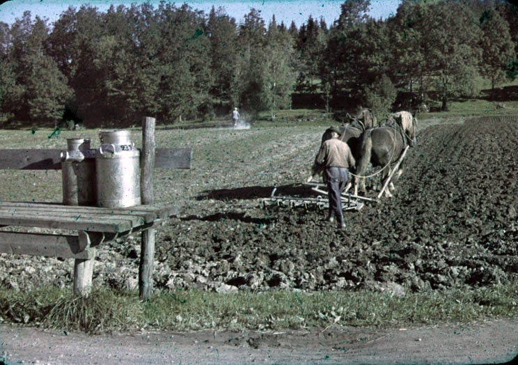 Jordbearbetning med två hästar och harv vårtid. På intilliggande mark går en man och sprider kalk för hand. Mjölkflaskorna har troligen återkommit efter att de har varit och tömts på ortens mejeri.