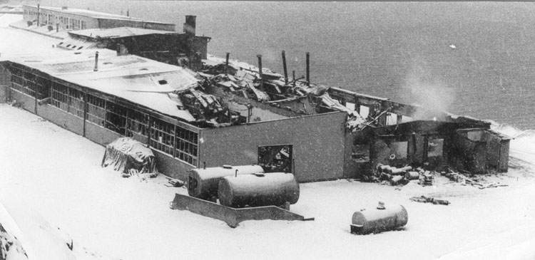Enligt fotografens notering: "Bansviks plåtfabrik Lys. no hamnen brinner ner 1965".